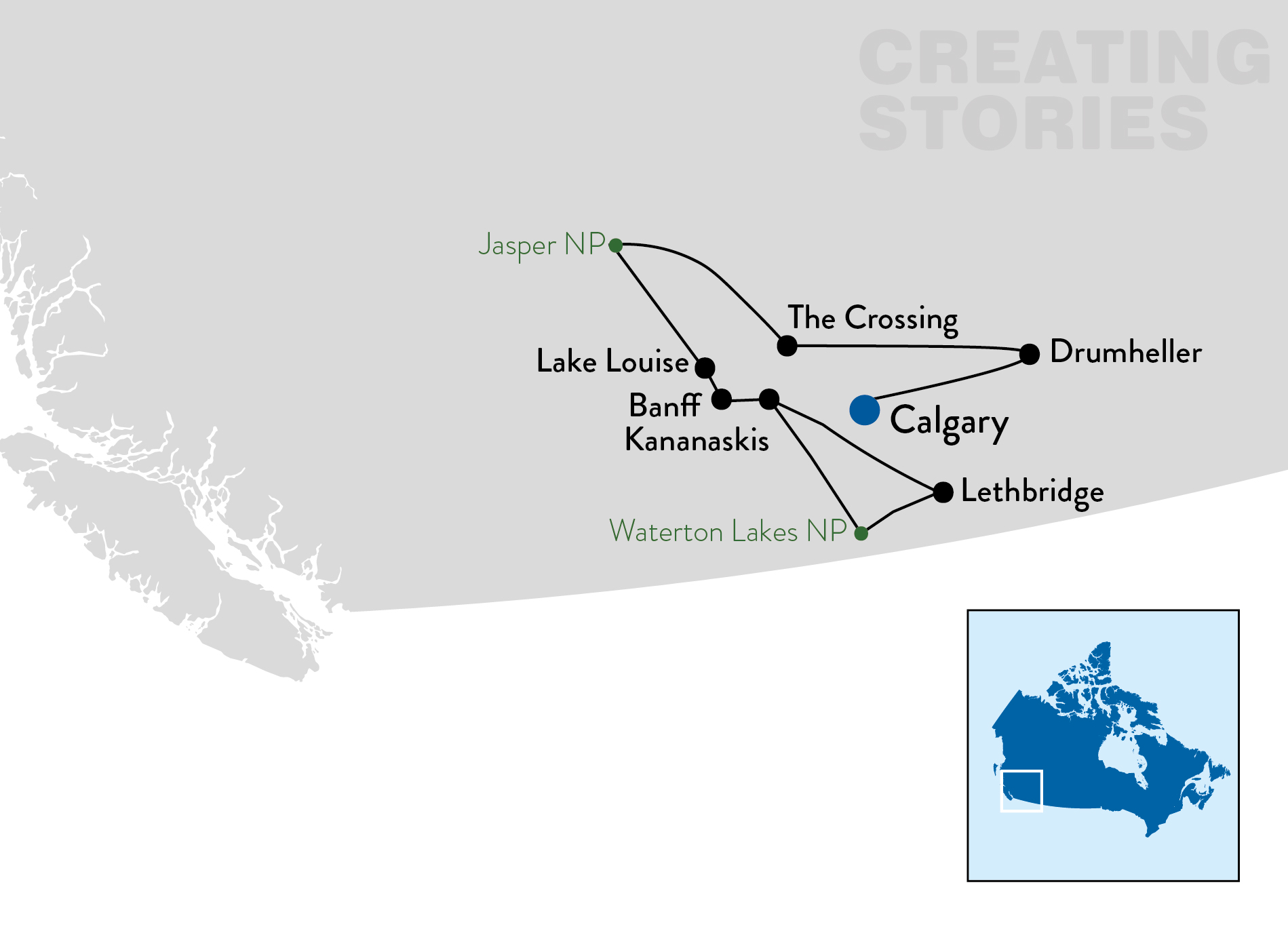 De weg naar Drumheller biedt een diverse verandering van landschap. Volg de weg en je zult veel HooDoo formaties zien. Dit is ook tevens de plek waar veel dinosaurussen zijn gevonden en je zult het Royal Tyrell museum bezoeken waar je van alles kunt leren over onze prehistorische geschiedenis.